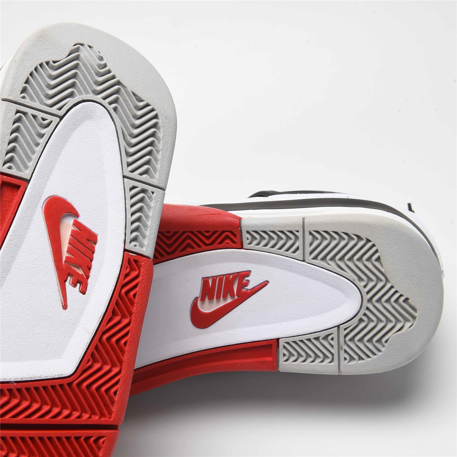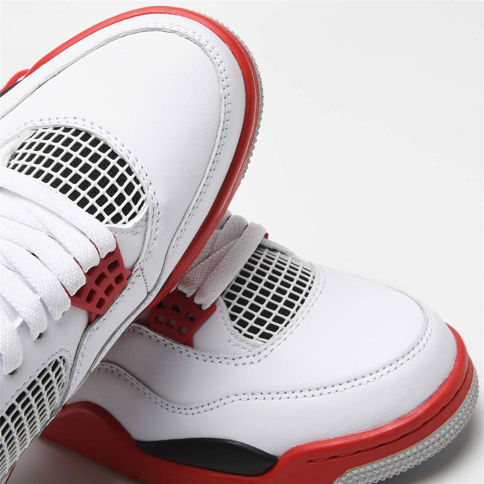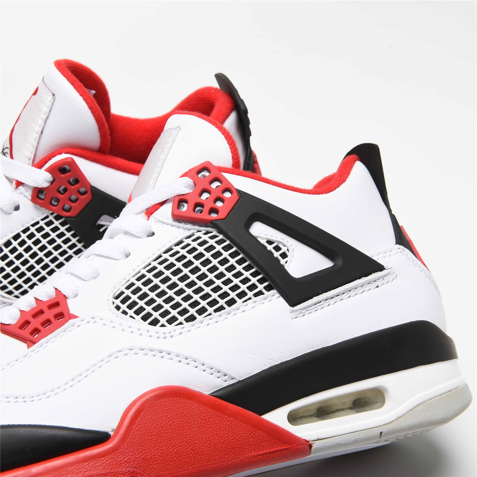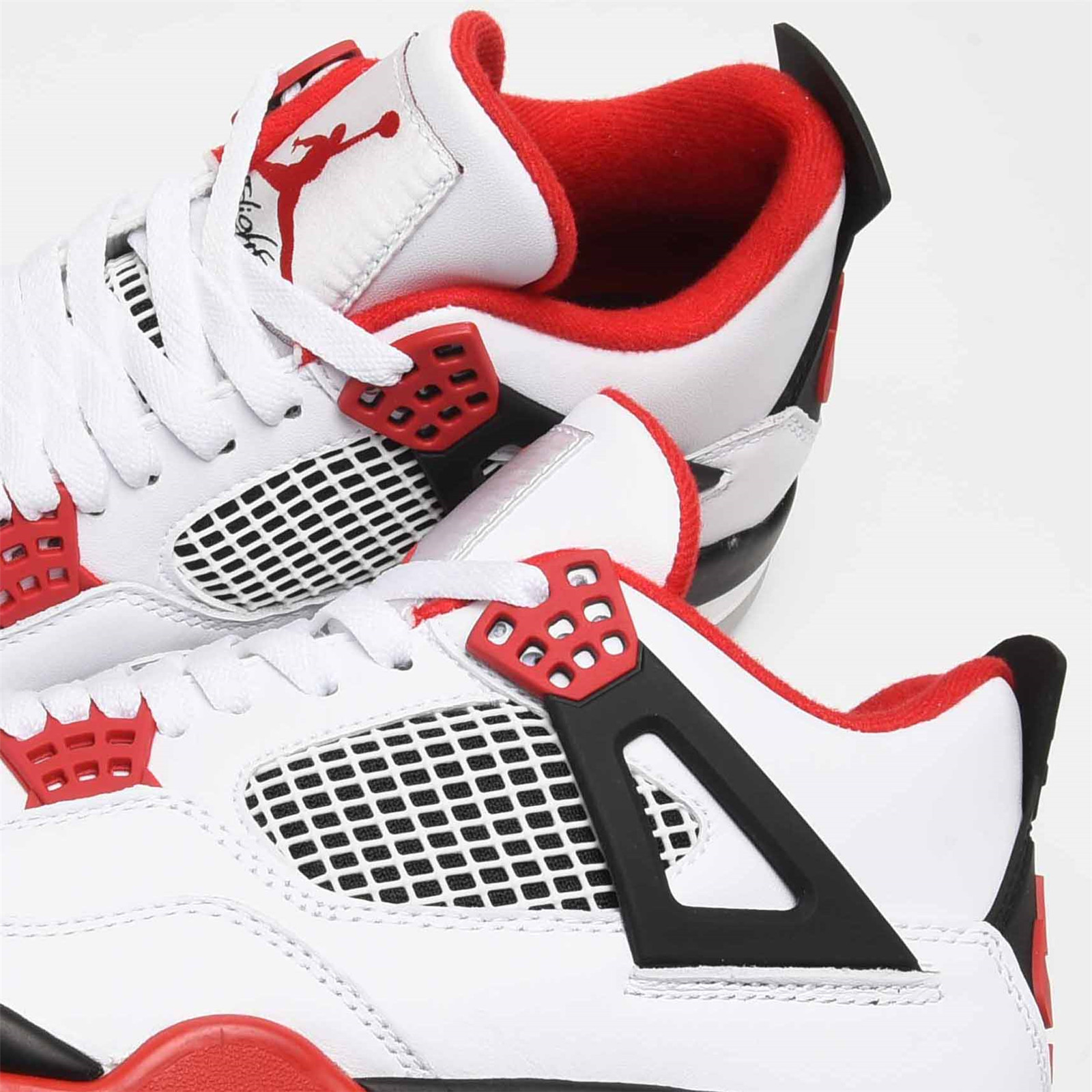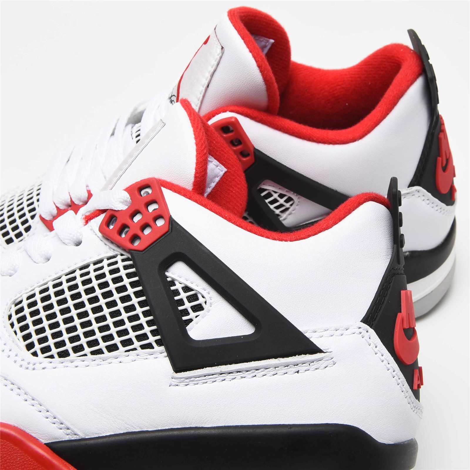 Jordan Brand revisited an iconic colorway with the Air Jordan 4 Fire Red. This release returns in its original form with "Nike Air" branded heels, making it the first time this colorway has retroed in this variation since its debut in 1989.This Jordan 4 consists of a white leather upper with black and Fire Red detailing. Rubber netted underlays, black heel tabs with "Nike Air" branding, and black with fire red midsoles completes this design.